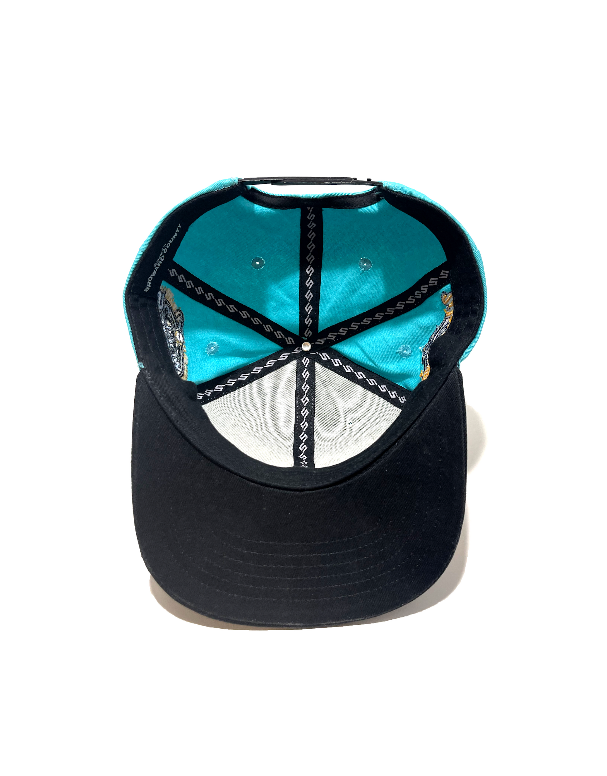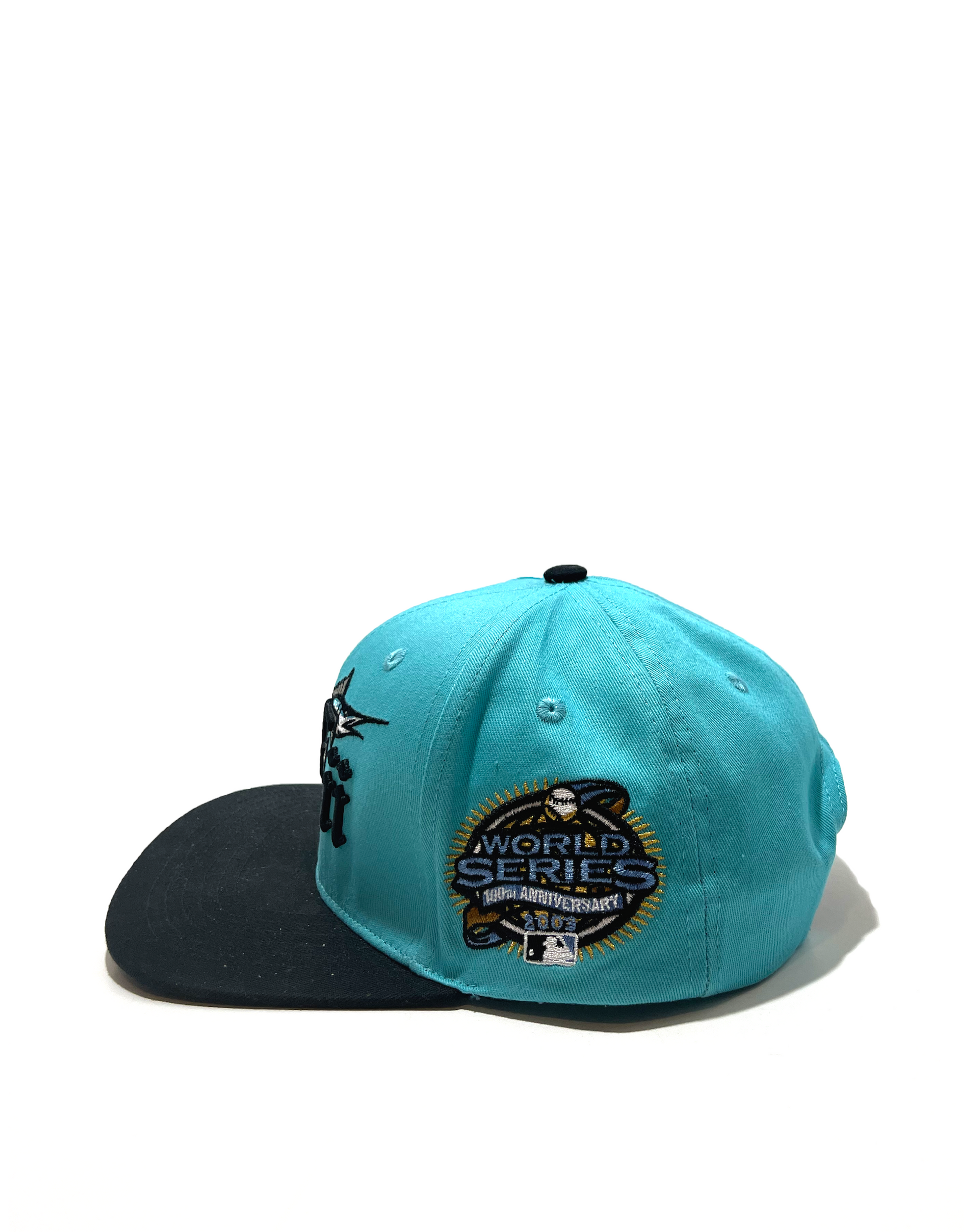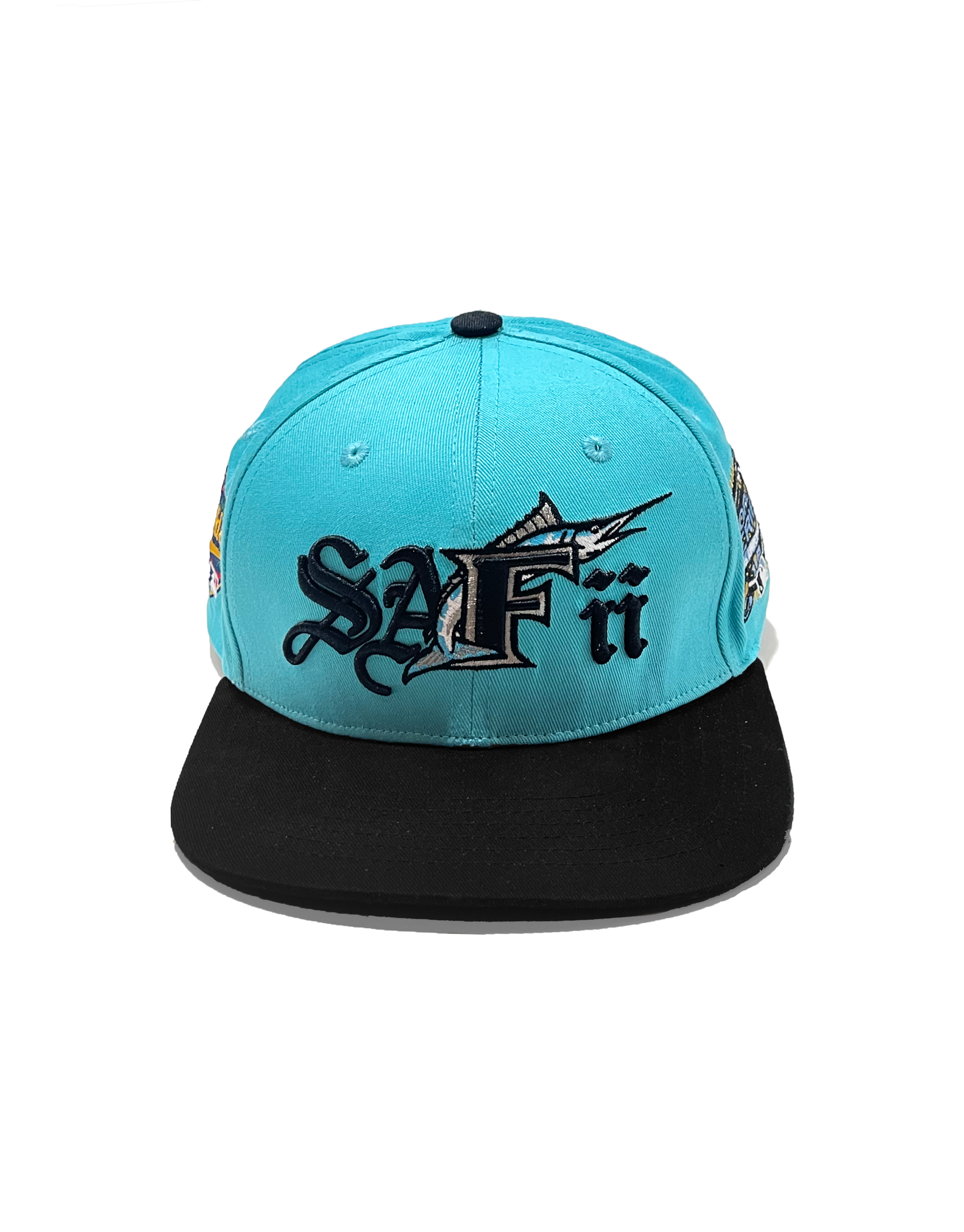 This snapback features SA'F'ii written across the crown in an old English font and the letter F is stylized as the Florida Marlins logo. The left and right side of the crown features the Florida Marlins respective World Series Championships.